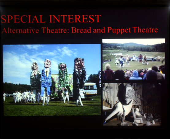 承接妻子的结论, StephenCrosby教授从文化表现上最易理解的戏剧开始切入主题。他概括了影响美国戏剧的四大因素,真实(Realism)、资本(Capitalism)、多元文化(Cultural Diversity)、特殊兴趣的戏剧(Special interest Theatre)。真实因素方面,他指出戏剧不仅能真实反映社会,还能对社会作出反应,帮助我们把事情往好的方向转变。资本因素方面,StephenCrosby教授谈到资本对美国现在戏剧创作和剧场的影响,介绍了美国商业性戏剧和非商业性戏剧得现状以及专业性和非专业性的剧场的情况。多元文化因素方面,StephenCrosby教授选取了非洲裔、拉丁裔、西班牙裔、亚裔和土著等少数民族的代表人物并展示了他们的经典作品。特殊兴趣的戏剧因素方面,他讲述了美国同性恋、女权主义和另类戏剧的创作和发展。