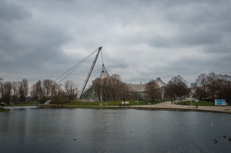上午11点26分,访学团一行跟随马林老师前往慕尼黑奥林匹克体育场。慕尼黑奥林匹克体育场位于慕尼黑奥林匹克公园的中心,是1972年德国慕尼黑夏季奥运会的主体育场,以颇具革命性的帐篷式屋顶结构闻名于世。走在公园的小径上,远远可见公园中心体育场的独特造型。随后,马林老师带领访学团走近体育场,并向访学团成员介绍道:“奥林匹克体育场的设计师曾从蜘蛛网形状得到的灵感,并受到帐篷结构的启发,从而设计了这个构想奇特、造型别致的体育场。这也使得该体育场拥有了一个半透明的屋顶,既保证了充足的进光量,亦使得场馆中具有丰富的光影变化,使坐在看台的人们犹如置身轻盈的艺术空间,更增添了体育场的神秘感。”说罢,便携访学团成员继续参观。