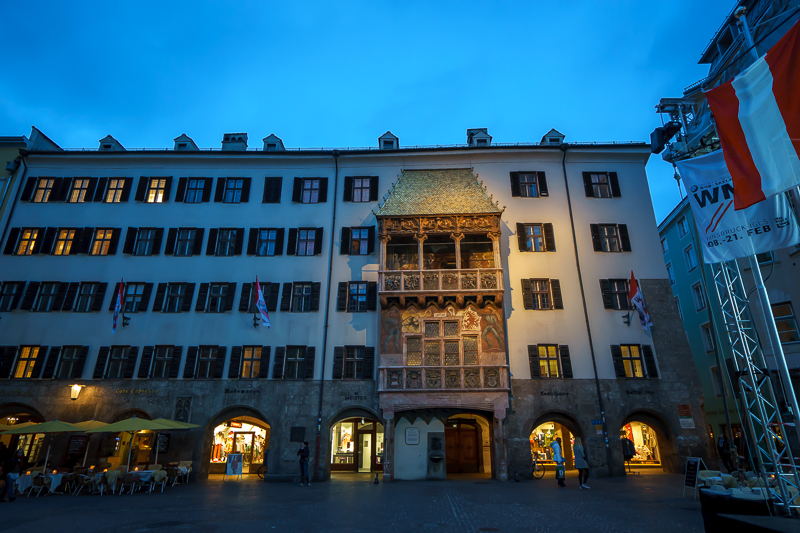 下午17点10分,访学团正式抵达因斯布鲁克,并在马林老师的带领下经老城区前往参观金顶屋。金顶屋位于因斯布鲁克城中心的弗利德里希公爵大街,仅屋顶就高达3.7米,且由2600块镀金铜瓦镶嵌而成,十分华丽。马林老师认为,金顶屋是在1494年间,马克西米利安一世迎娶西班牙公主之际,由马克西米利安委任尼克拉斯修建而成。它将原有的破旧楼房改建为哥特式穹窿的观赏阳台,以便在此观赏戏剧和表演。参观完毕,马老师更携访学团全体成员以金顶屋为背景,在广场前合影留念。