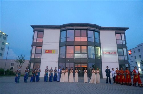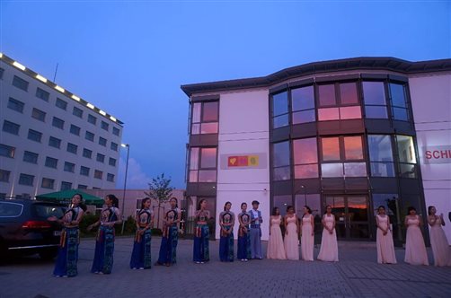 为了10日更好地呈现精彩的节目,在酒店门口空地学生们穿上演出服装,在余晖下一个节目接着一个节目的排练走队形,吸引了很多德国住客的围观和赞扬。