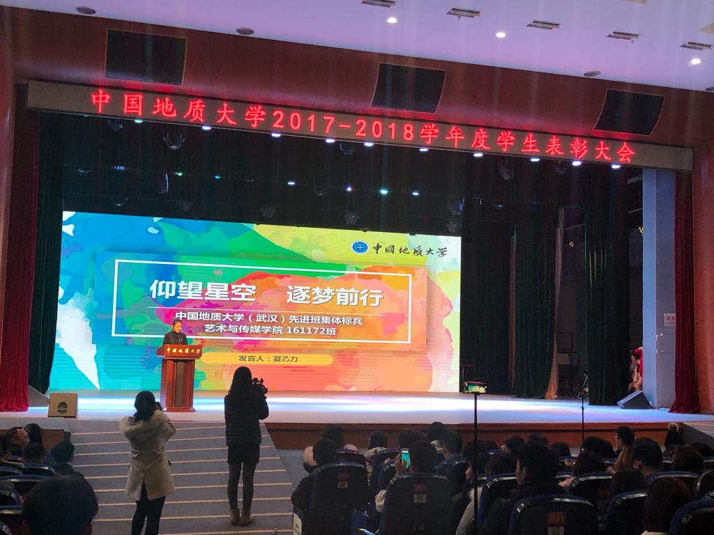 本科2017级161172班班长夏乙力同学作为年度先进班集体标兵获奖班级代表,以《仰望星空,逐梦前行》为题做大会主题发言,分享了杏色