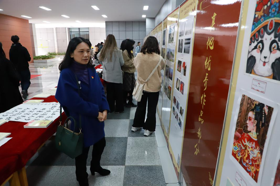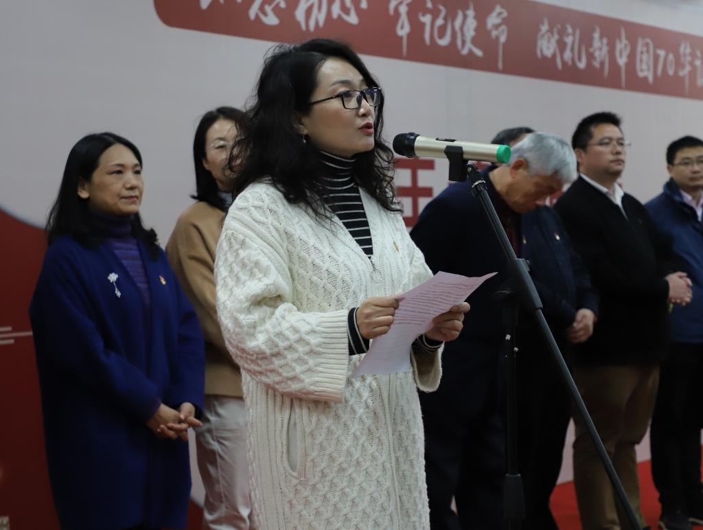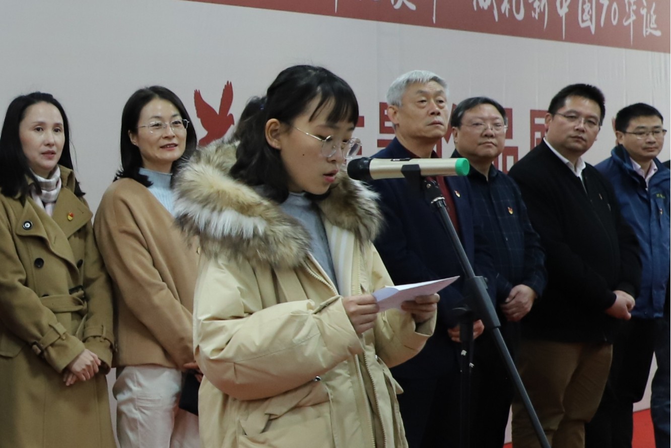 郭秀蓉致开幕词,她表示,主题作品展是艺媒学子用属于艺媒人的独特方式,通过绘画设计、摄影摄像、艺术表演等形式,向伟大祖国献上的真挚祝福,也是学院党委在全院师生中深入开展“不忘初心 牢记使命”主题教育的创新探索。本次主题展也是学校给艺媒学子提供的一个很好的展示成果和学习交流平台。郭秀蓉最后对全院师生提出期望:学院将认真学习贯彻中央关于美育工作的精神指示,抓好专业教学,加强学科建设,浓厚美育氛围,整合更多资源推进学校美育工作,希望全体艺媒学子扎根时代生活,勇肩时代使命,在艺术创作中实现人生价值,为学校早日建成地球科学领域世界一流大学汇聚磅礴力量。