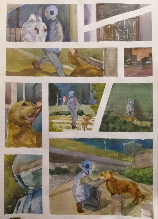 (设计说明:这副作品通过明暗、色彩饱和度对比来突出了医生与病毒之间的抗争。左下角代表祖国的大好河山,医生用脚步走遍且不间断的前行,不问归期。而在画面上方是黑暗的病毒,医生的到来燃起生命的光芒,驱赶着这些病毒…这副作品表达了对医务人员的赞叹和暗示他们的光明前程。)