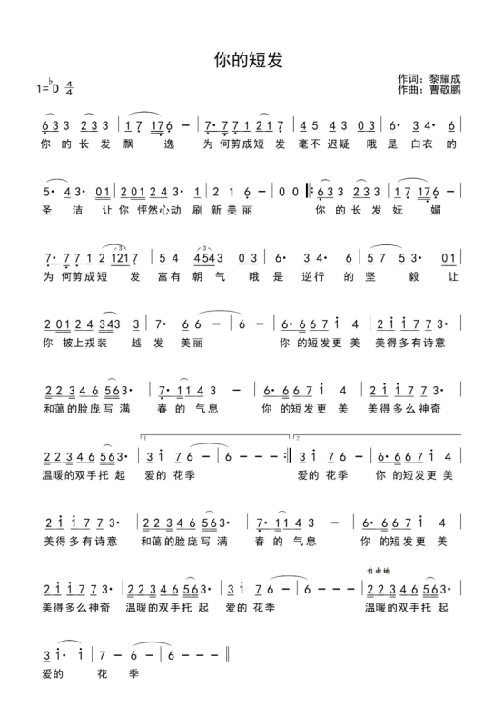 《你的短发》由中国音乐家协会黎耀成作词,杏色