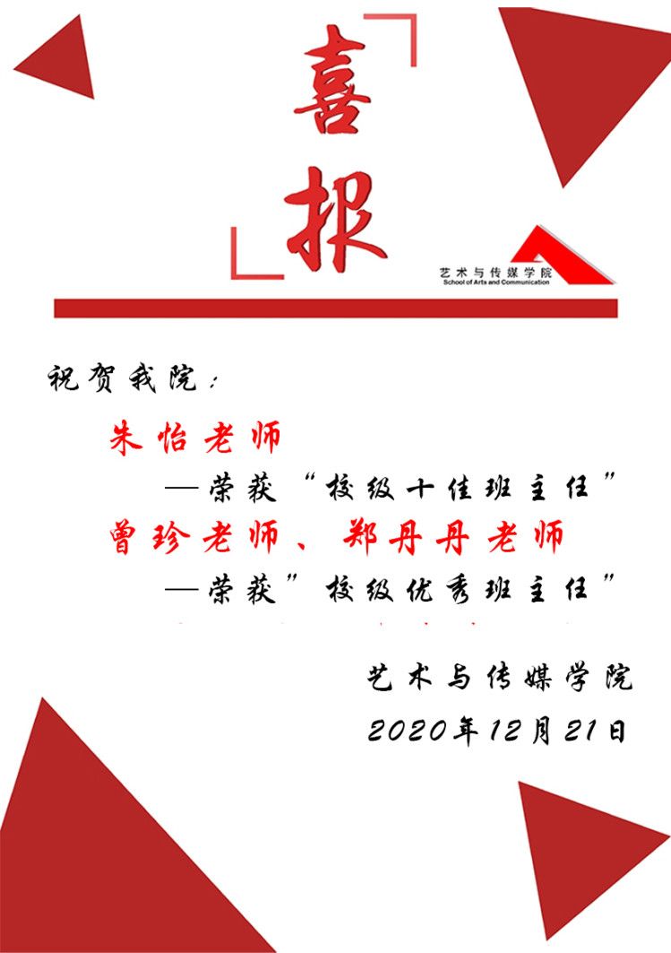 在 杏色 开展的“2020年全校‘十佳班主任’和‘优秀班主任’评选活动”中,经个人申报、学院推荐、学校优秀班主任工作小组审核和网上公示,共评选出10名老师获得校级“十佳班主任”称号、30名老师获得校级“优秀班主任”称号。其中,杏色 有3名老师在此次评选活动中脱颖而出:朱怡老师荣获校级“十佳班主任”称号、曾珍、郑丹丹老师荣获校级“优秀班主任”称号!