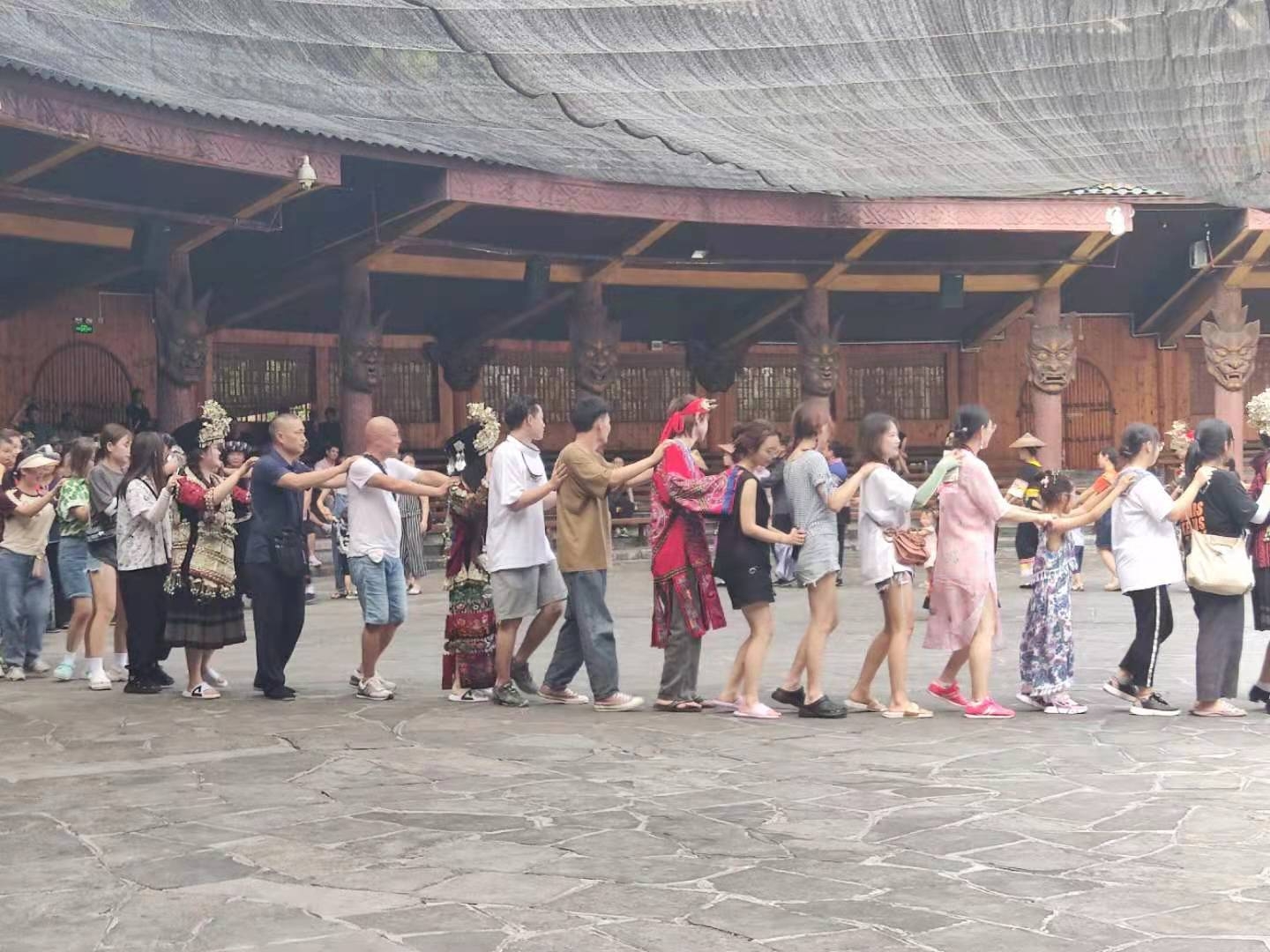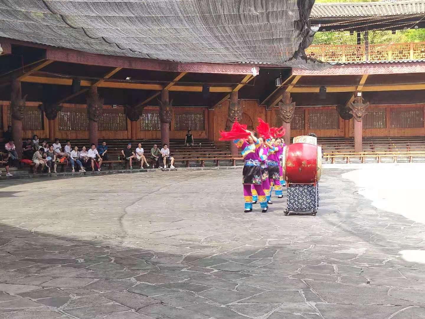 11号我们来到了德夯苗寨,从吉首到德夯要经过著名的公路奇观,被称为天路的湘川公路,这里是矮寨天险,全长六千米却转了13道弯。沿岸筒车、水碾、古渡、小舟,伴着苗寨的吊脚楼,一派田园诗情。天性浪漫的苗族人在这里日出而作,日落而息,由于地处深山,位置偏僻,千百年来很少与外界接触。这里就成为了中国苗寨中保存最完整、苗族习俗最浓郁的地方,也是苗族体育文化的沃土。我们紧接着欣赏了极具特色的苗鼓苗歌表演,翩翩起舞,鼓声铿锵。银饰随着灵动的步伐一起嗽嗽做响,美丽的苗服和翩跹的舞姿抓人眼球。最后同学们也参与了苗舞的互动,学会了简单的苗舞步伐,深深感受到当地的异域风情,也为今后的艺术创作提供了素材。