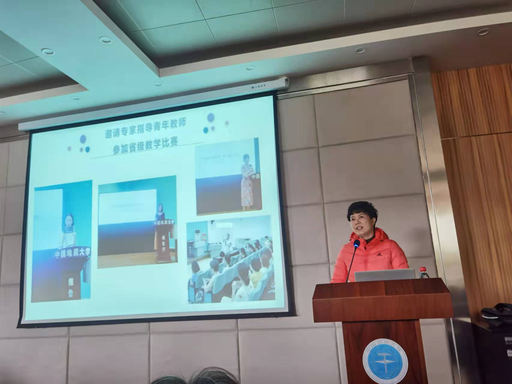 教师职业能力提升计划专题培训”第三场在1104学术报告厅如期举行, 外国语学院刘芳副教授作题为“高校教师教学研共同体建设--理论与实践”的主题报告,报告由党委书记郭秀蓉主持,全体教职工参加。