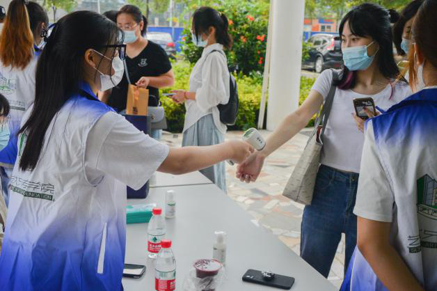宿舍楼下有学长学姐们温暖相助,帮忙搬运行李。艺媒楼门口有志愿者们指引报道方向,为防控疫情测量体温、检查行程码,接着在迎新志愿者的引导下,同学们有序前往艺媒楼报道。