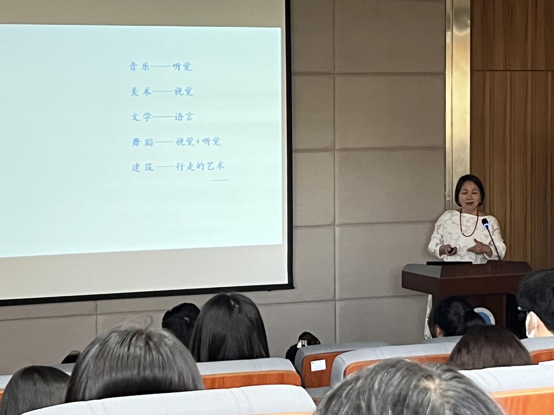 讲座由音乐系主任周莉副教授主持。首先,学院副院长袁玥副教授介绍了朱梅梵教授情况。朱梅梵,武汉理工大学本科生院素质教育中心,教授,博导,教育部学位中心评审专家、全国大学生文化素质教育学会理事、湖北省高校艺术教育研究会秘书长、全国美育研究会理事。出版多部文化艺术类专著、教材及音乐专辑;在《光明日报》理论版、《中国高等教育》、《中国高教研究》等重要期刊上发表论文30余篇;在中国MOOC平台录制上线《中国民族音乐》获国家精品课程;2011年和2016年在武汉音乐学院编钟音乐厅成功举办由省教育厅、省文化厅组织的两场个人独唱音乐会。