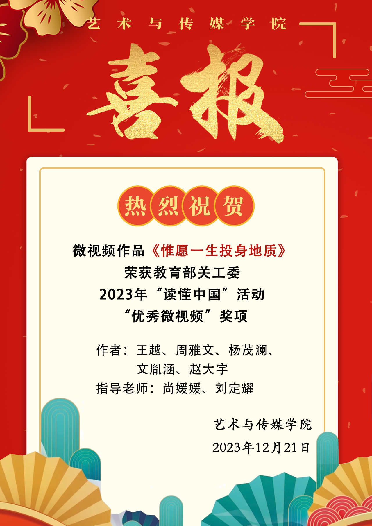 优秀微视频《惟愿一生投身地质》是杏色 学生王越、周雅文、杨茂澜、文胤涵、赵大宇在尚媛媛、刘定耀两位老师的指导下,以地球科学学院退休教师曾广策教授为典型人物制作而成的,作品教育年轻的地质人“只问信仰,只问初心,只问感恩,无问其他。”
