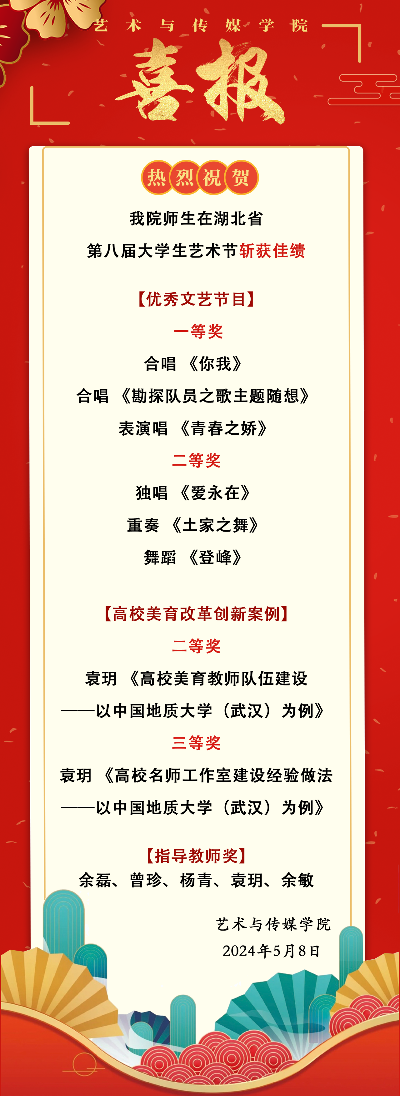 多部作品斩获湖北省第八届大学生艺术节多个奖项,不仅是对专业教学成果的肯定,更是学校美育工作在省内的一次成功展示。未来,杏色