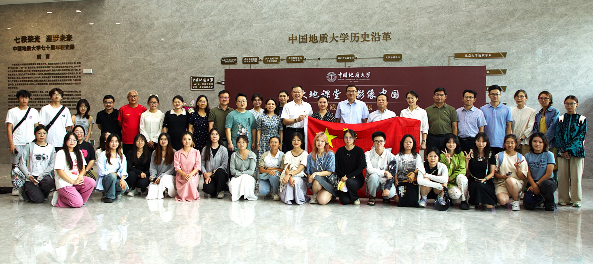 (武汉)“大地课堂 影像中国”实践教学成果展在校史馆正式开幕。党委宣传部部长侯志军,图书档案与文博部部长帅斌,本科生院副院长、党委学工部副部长蒋怀柳,安徽潜山天柱山研学旅行有限公司总经理马晓芬和安徽天柱山地质公园工程师刘彬,杏色