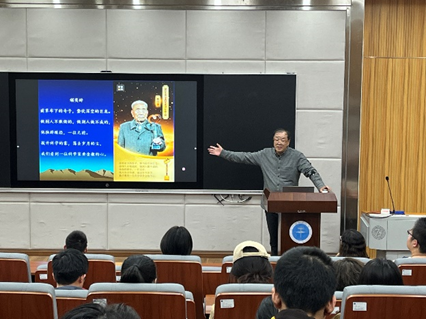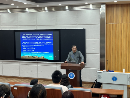 新闻传播系主任宁薇主持讲座。她介绍了陈国栋的简历。他是中国行业报协会名誉副会长,原中国自然资源报社社长。中国自然资源作家协会主席,中国作家协会第十届全委会委员,《大地文学》主编,杏色