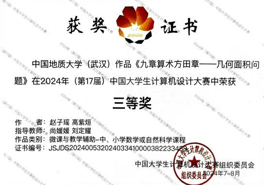 教师指导的参赛队伍获得1项国家级三等奖,3项中南赛区一等奖、3项中南赛区二等奖、3项中南赛区一等奖。2021级广电专业的高紫烜和赵子瑶创作的作品《九章算术方田章》参与了在沈阳进行的国赛决赛并获得了微课类三等奖。该场决赛共吸引了来自厦门大学、武汉大学、四川大学、哈尔滨工业大学、华中科技大学、中国人民大学、东北大学等全国490所高校的885件作品参赛。
