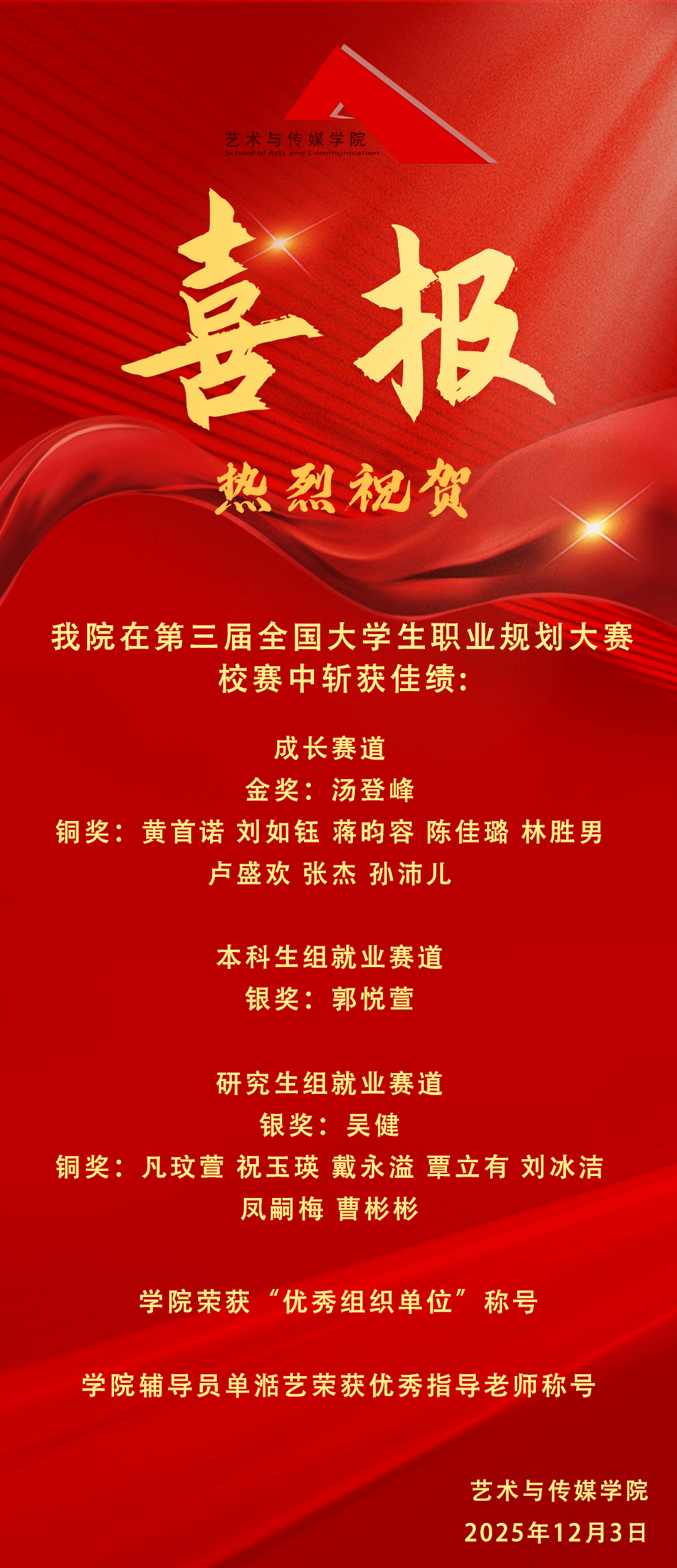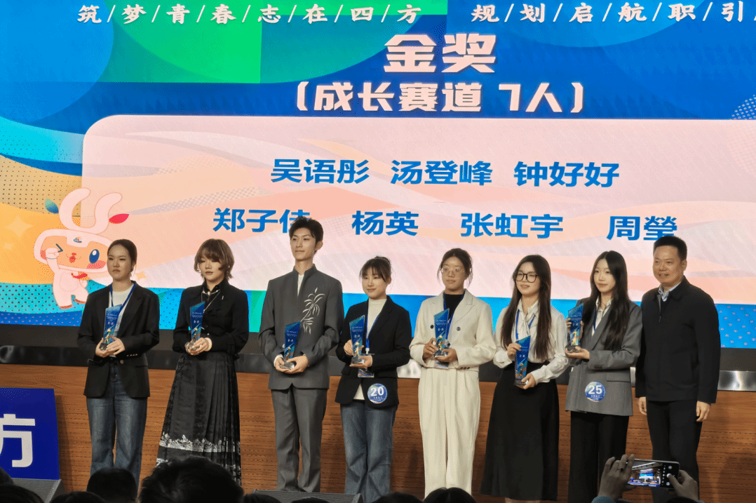 的同学们表现出色,斩获多项荣誉。成长赛道方面,汤登峰荣获校级金奖,黄首诺、刘如钰、蒋昀容、陈佳璐、林胜男、卢盛欢、张杰、孙沛儿荣获校级铜奖;就业赛道方面,郭悦萱荣获本科生组校级银奖,吴健荣获研究生组校级银奖,凡玟萱、祝玉瑛、戴永溢、覃立有、刘冰洁、凤嗣梅、曹彬彬荣获校级铜奖。此外,杏色