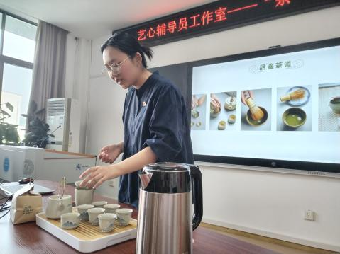 曾老师从茶叶的起源、种类、功效等方面向同学们讲解了茶文化,在了解完茶文化的相关内容后,向同学们展示了茶艺之美,并现场为同学们冲泡西湖龙井,感受绿茶的香气与口感,体验茶道的韵味。