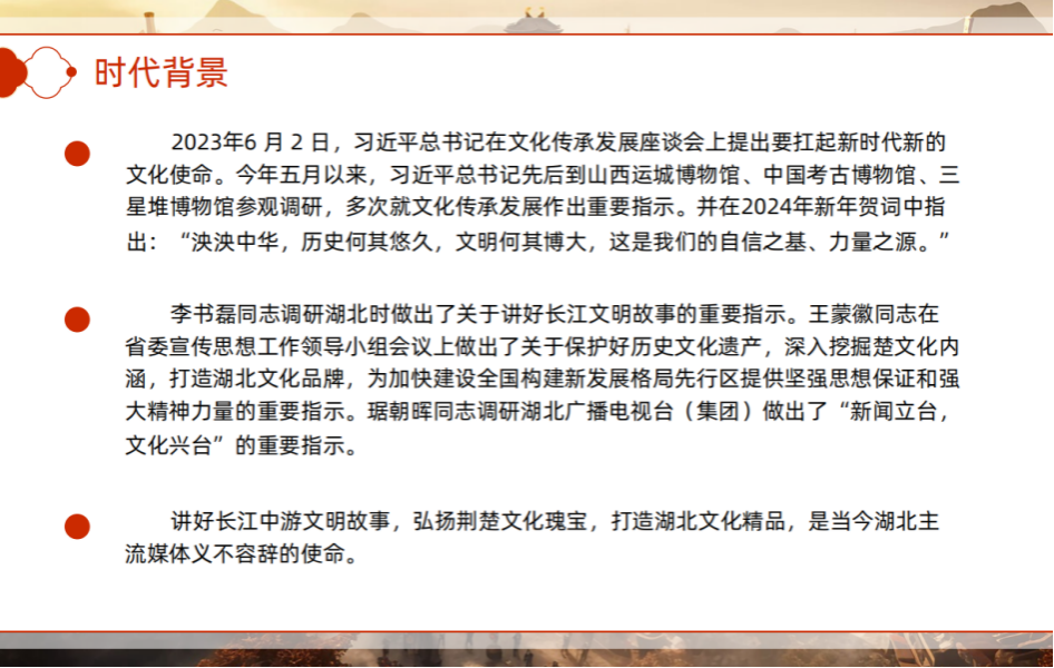 陈老师从纪录片《石家河》介绍、实习生招聘简介、现场答疑三个方面为学生们展开讲解。首先,陈老师从纪录片《石家河》的时代背景和创作宗旨出发,表示当前传播荆楚文化与讲好长江文化故事的重要性,结合石家河的地理位置和文化底蕴说明选取纪录片地点的原因。