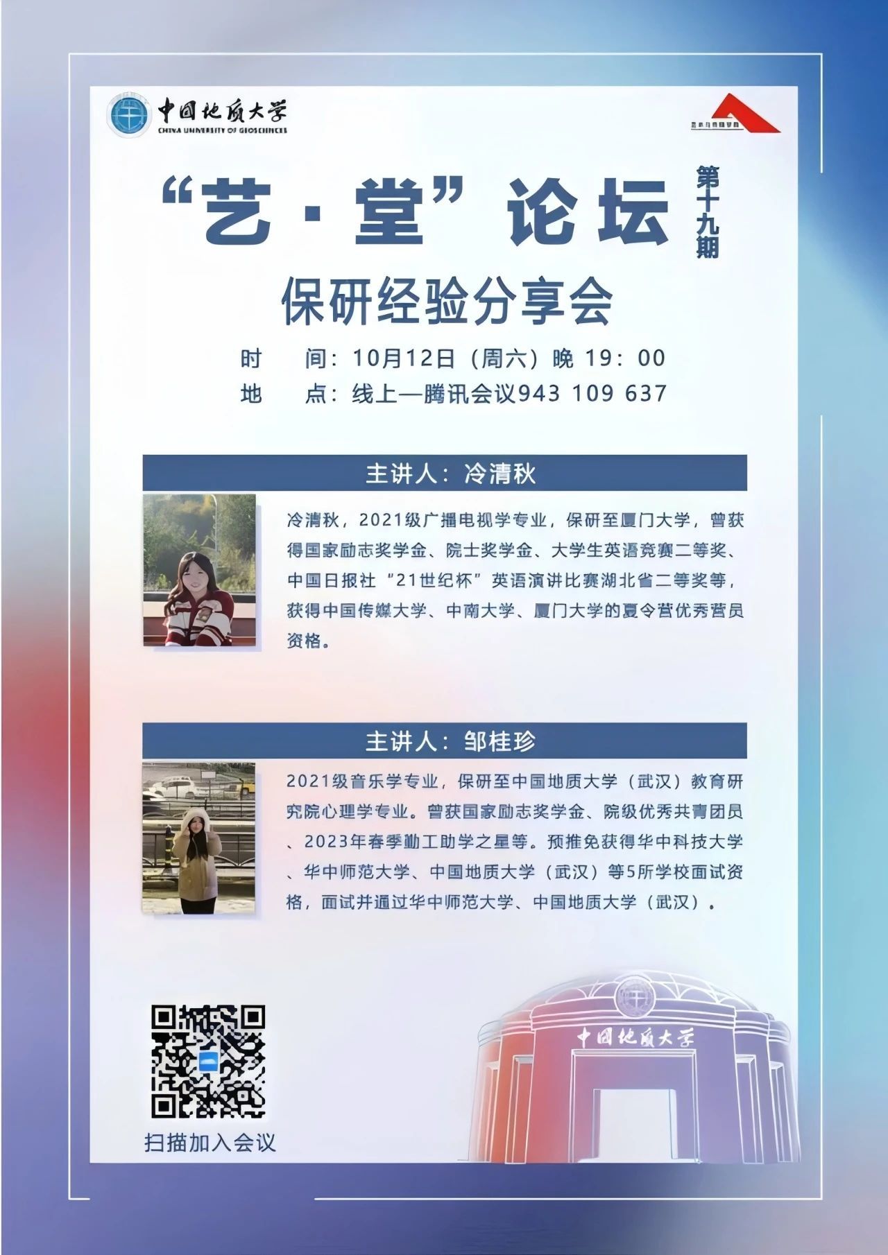 2024年10月12日晚上19:00,“艺·堂”论坛第十九期保研经验分享会顺利举行。学院邀请了2021级本科生冷清秋和邹桂珍为同学们进行保研经验分享。本次讲座由兼职辅导员廖文琦主持。