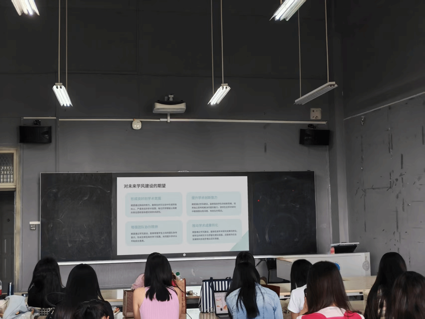 主题班会上,各班级邀请系主任、研究生辅导员等老师传达学院学风建设要求,强调学风重要性,并围绕课堂纪律、学习态度、考风考纪、学术诚信等方面展开讨论,形成问题清单,合力建立良好的班风和学风。