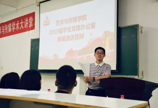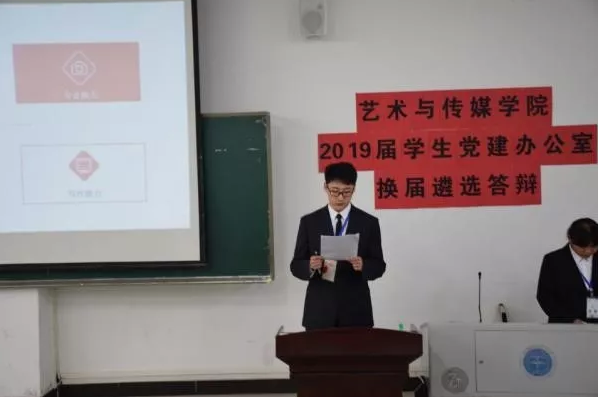 党委副书记吴仁喜,党建办主任熊程,以及学生会主席戴传知,2017届党建办常务副主任袁苑和王其伟,2018届党建办常务副主任李蕾和陈诗睿出席并担任评委。2019届艺媒学院学生党建办公室常务副主任及各部门部长候选人进行答辩。