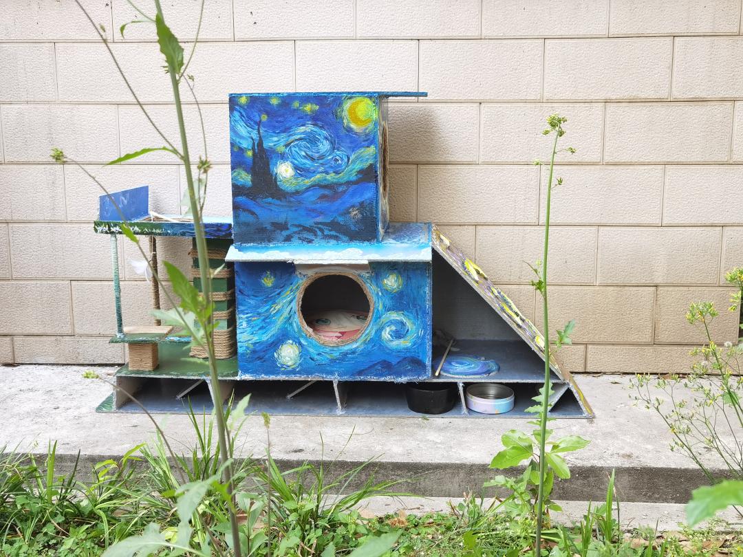 我们给这个猫舍取名为“喵星事务所”,设计理念是我们认为校园里的流浪猫都生活在遥远的喵星球,而我们设计的猫舍是人与猫交流互动的特定场所,猫猫可以在这里沉浸式与人互动,并且享受喵生。我们在猫舍的装饰上选择了梵高的《星月夜》,更加贴合我们的设计理念。