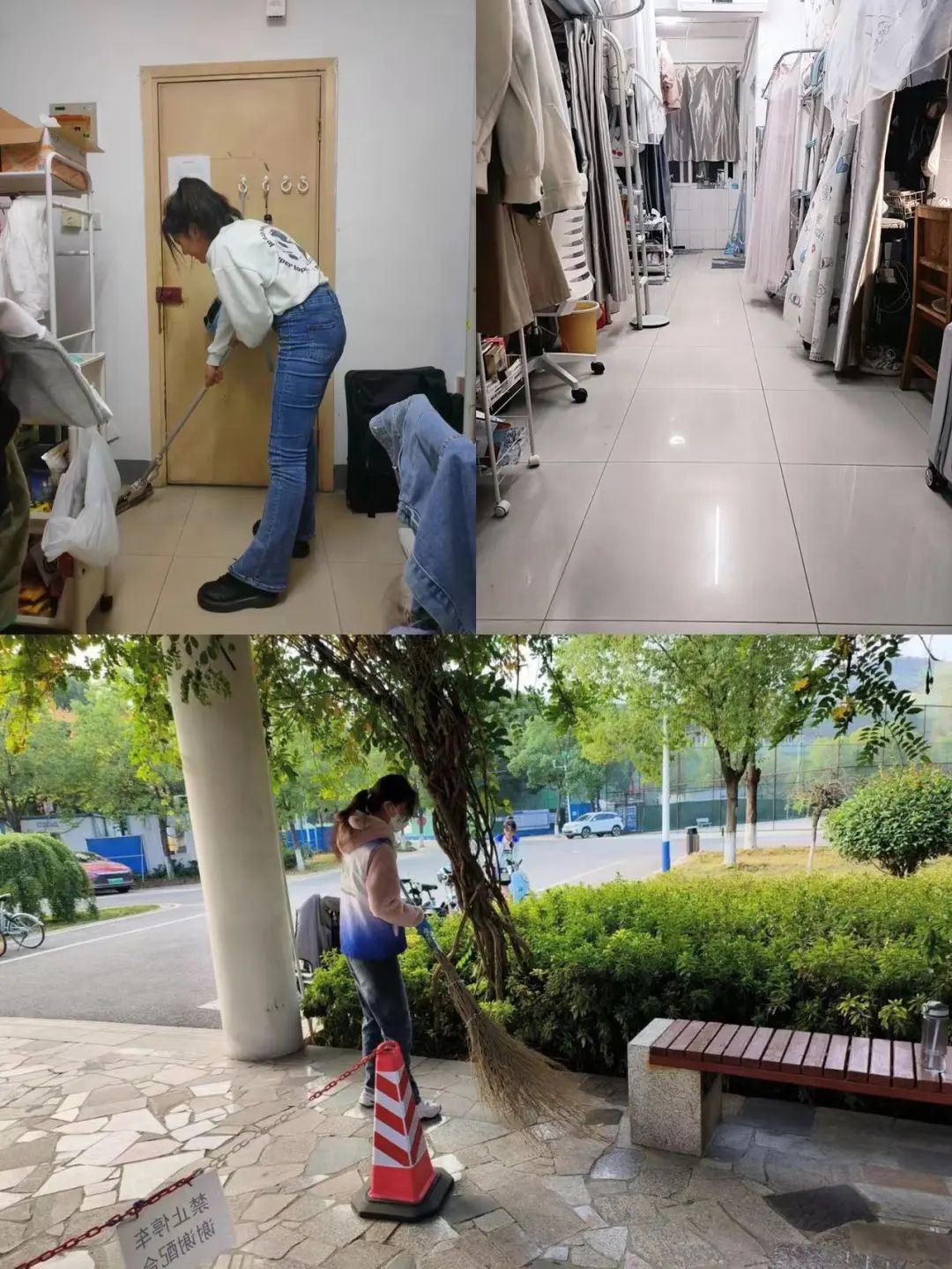 学院教职工和同学们集中对办公区域、学生宿舍、楼梯走廊等进行打扫和清理;学院青年志愿者协会通过招募志愿者,组织开展学生志愿活动,主动对学院展厅、过道、周边绿化带等进行打扫。他们有的手提垃圾袋,清理艺媒楼周边垃圾;有的拿着扫把,清扫道路上的落叶;有的拿着抹布认真打扫办公桌、玻璃和座椅;还有的将共享单车一一摆放整齐,确保人人行动起来、宿舍整洁起来、学院干净起来。