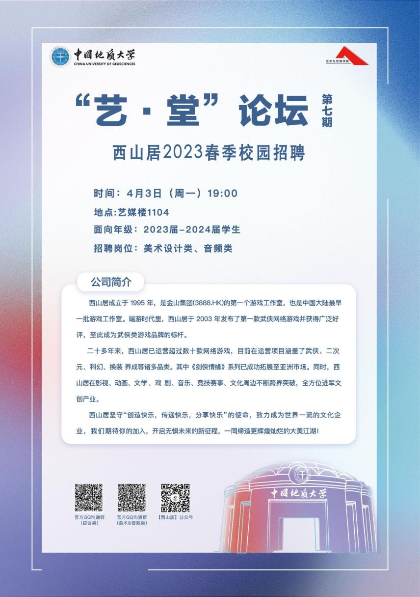 4月3日晚19:00,“艺·堂”论坛第七期在1104报告厅顺利召开,本次论坛由金山软件公司西山居举办春季校园专场招聘会。