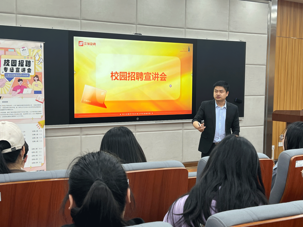 首先,田总围绕企业概况、招聘需求、校企合作三个方面向同学们介绍七家公司的基本情况,并与同学们分享三维空间团队所获2019届“国际建筑三维大赛”设计金奖的优秀案例,以帮助同学们了解国际及商业作品的设计思路、设计难点与解决方法。