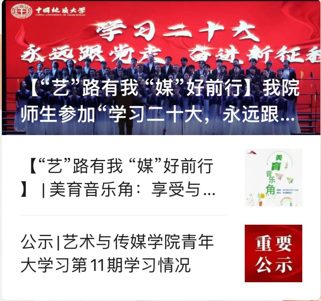 微信公众号“CUG艺媒人”致力于丰富同学们的课余生活,做好各项通知、要闻的二传手,帮助同学们了解学院最新动向以及和自身发展、生活有关的各项事宜。因2021年疫情影响,杏色
