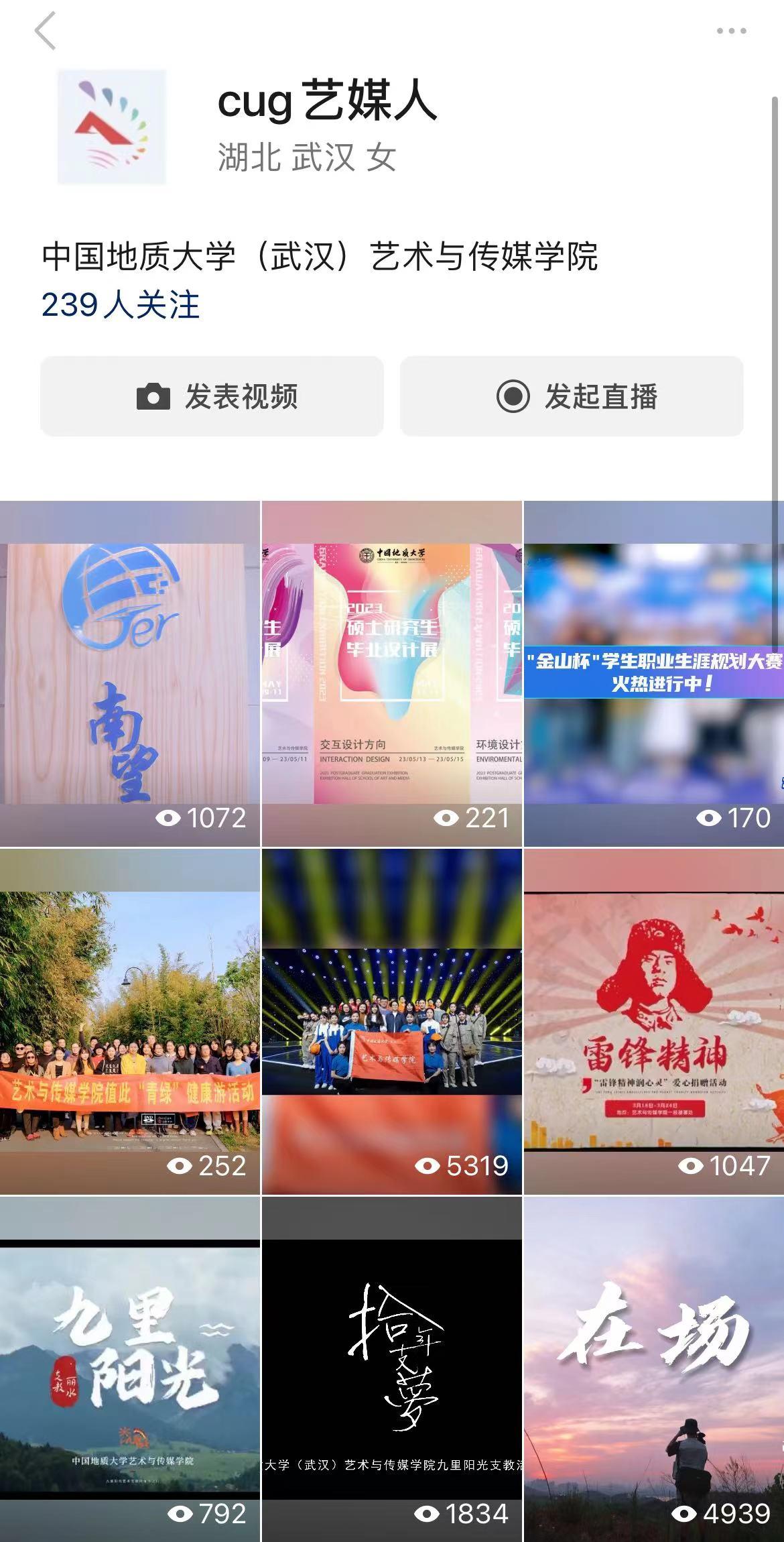 新媒体时代,CUG艺媒人不再只运营公众号,去年开设的视频号的“cug艺媒人”,在经过一年的精心运营下共发布原创视频39个,总播放量为38977,在当下短视频流行的年代,创新和丰富了新媒体作品的表现方式,记录艺媒人的点滴生活,留存珍贵回忆。如:《拾年 支梦》杏色
