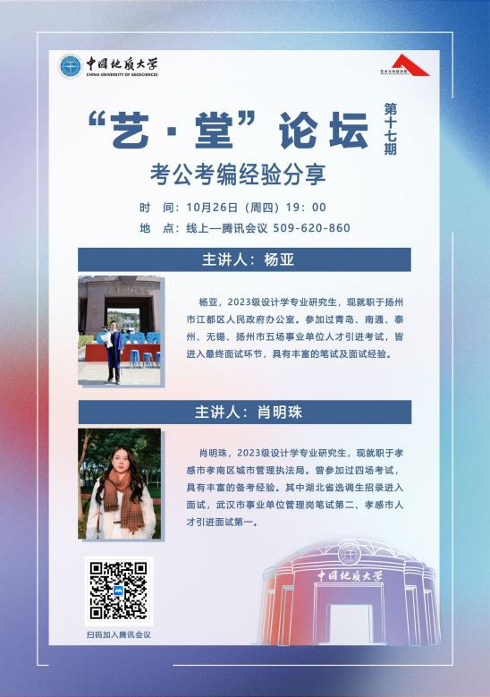 2023年10月26日晚上19:00,“艺·堂”论坛第十七期考公、考编经验分享会于线上腾讯会议平台顺利举行。学院邀请了2023届研究生毕业生、现就职于扬州市江都区人民政府办公室的杨亚和就职于孝感市孝南区城市管理执法局的肖明珠进行备考分享。本次讲座由兼职辅导员杨滢主持。