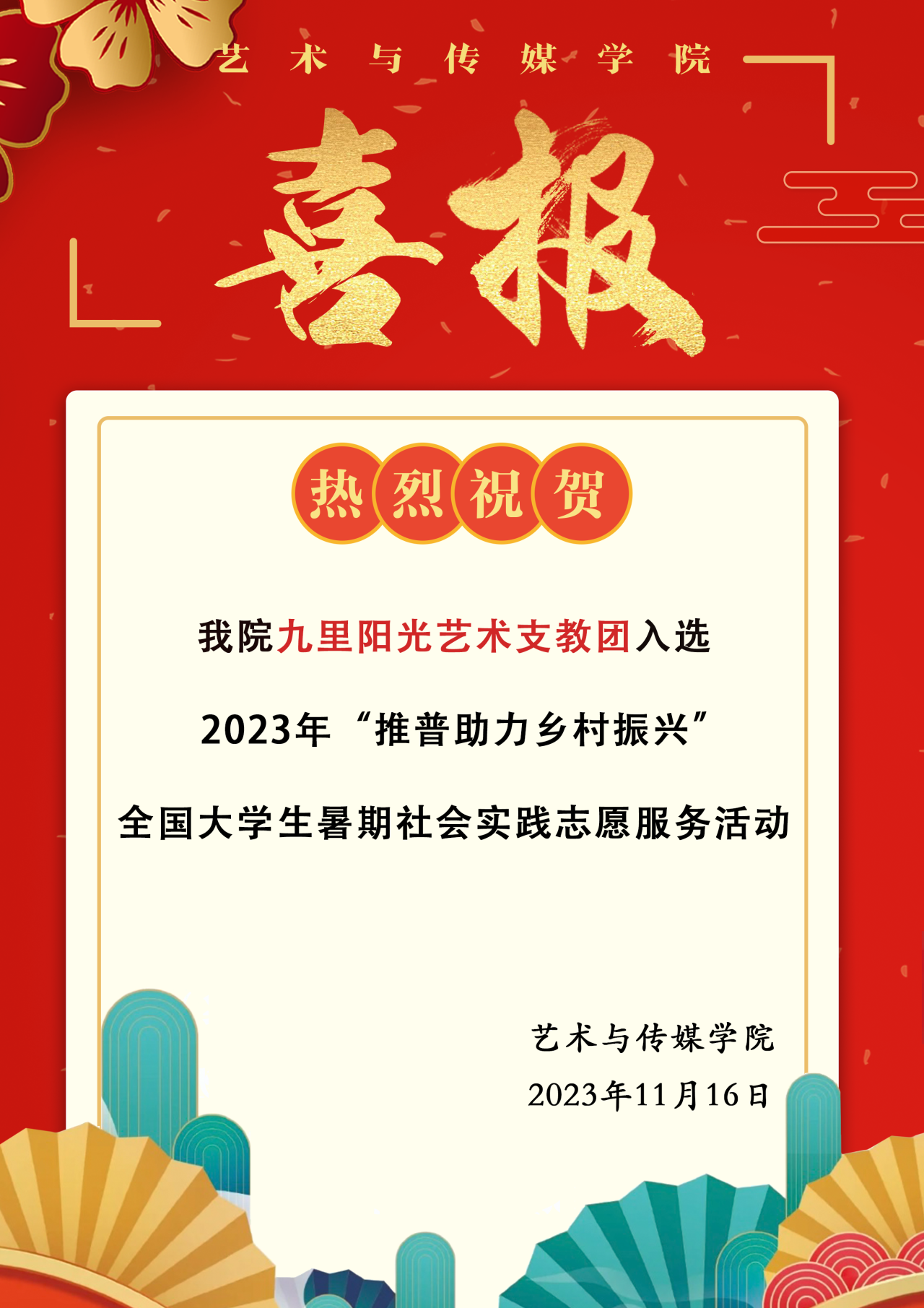 喜报|热烈祝贺杏色 九里阳光艺术支教团入选2023年“推普助力乡村振兴”全国大学生暑期社会实践志愿服务活动