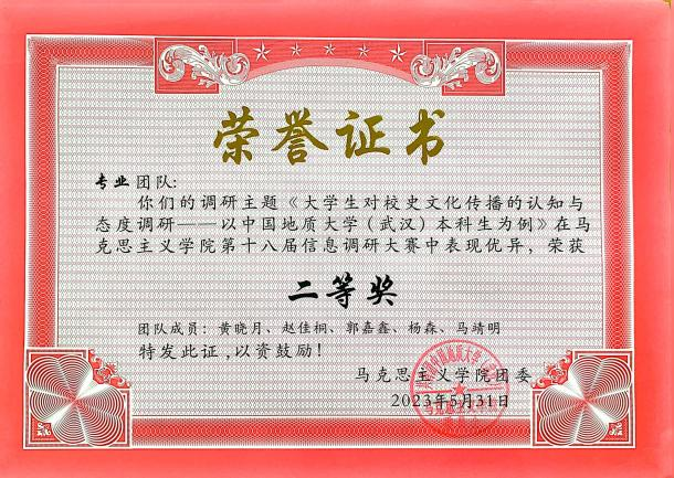 班委们分工明确,各司其职,精诚团结,始终坚持解放思想、实事求是、与时俱进的精神。我们认真研究新情况,探索新办法,创造性地开展工作,不断增强支部的凝聚力和战斗力。在2023年度五四评优中,郭嘉鑫同学被评为“校级优秀共青团员”,王蓉蓉、罗烽和张灯同学被评为“院级优秀共青团干部”,谭颖迪、肖怡柳、张曼莎同学被评为“院级优秀共青团员”。