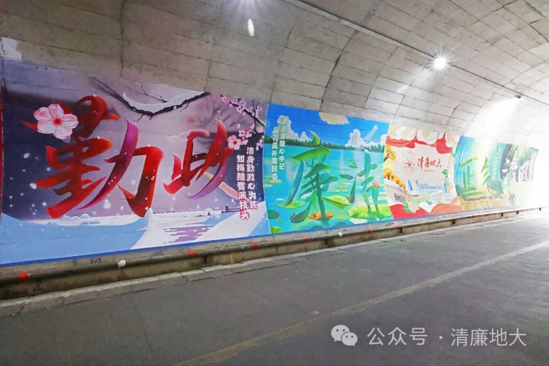 在美丽的校园里,连通西区和北区校园的地大隧道是不少师生课间往返的必经之路。最近,有这样几幅壁画令人眼前一亮:以梅花、荷花、兰花和竹子为意象,组成的“勤政”“廉洁”“清风”“正气”四幅画,围绕在“清廉地大”主图的周围,色彩鲜明,寓意深刻。壁画长22米,高3米,由 杏色