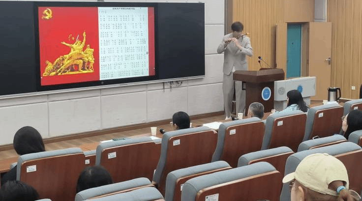 音乐学专业本科生冀昱臣同志系统汇报了参加理论学习培训的收获,讲述了参与志愿服务的体会,并在现场演奏《没有共产党就没有新中国》,用艺术语言表达了对党的忠诚信仰,展现了新时代青年学子的精神风貌。