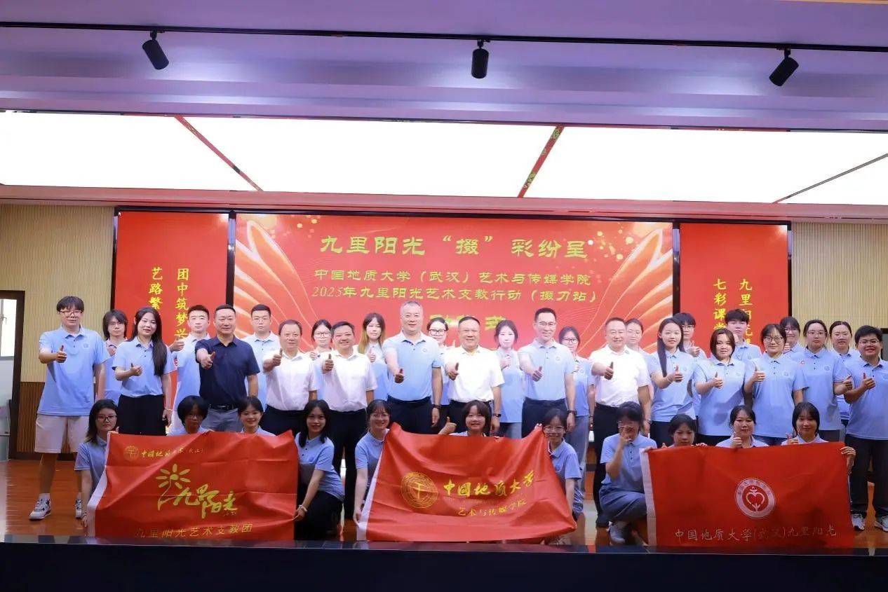 2025年7月3日上午,中国地质大学(武汉)艺术与传媒学院“九里阳光”艺术支教团荆门市掇刀区站启动仪式,在团林中学顺利举行。掇刀区委常委、常务副区长陈启富,区教育局党组书记、局长苏强,区教育局党组成员、副主任督学孙荣辉,团林中学、团林小学校长李玉华、肖锋及相关负责人、班主任代表,中国地质大学(武汉)艺术与传媒学院党委书记冷再心、党委副书记边建华,支教团全体成员,团林中学20名学生代表共同见证了这一时刻。