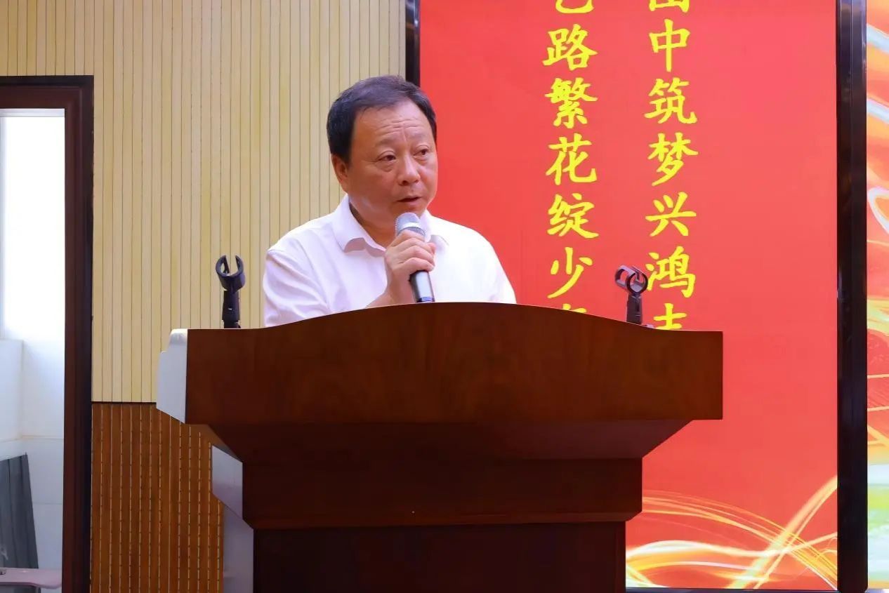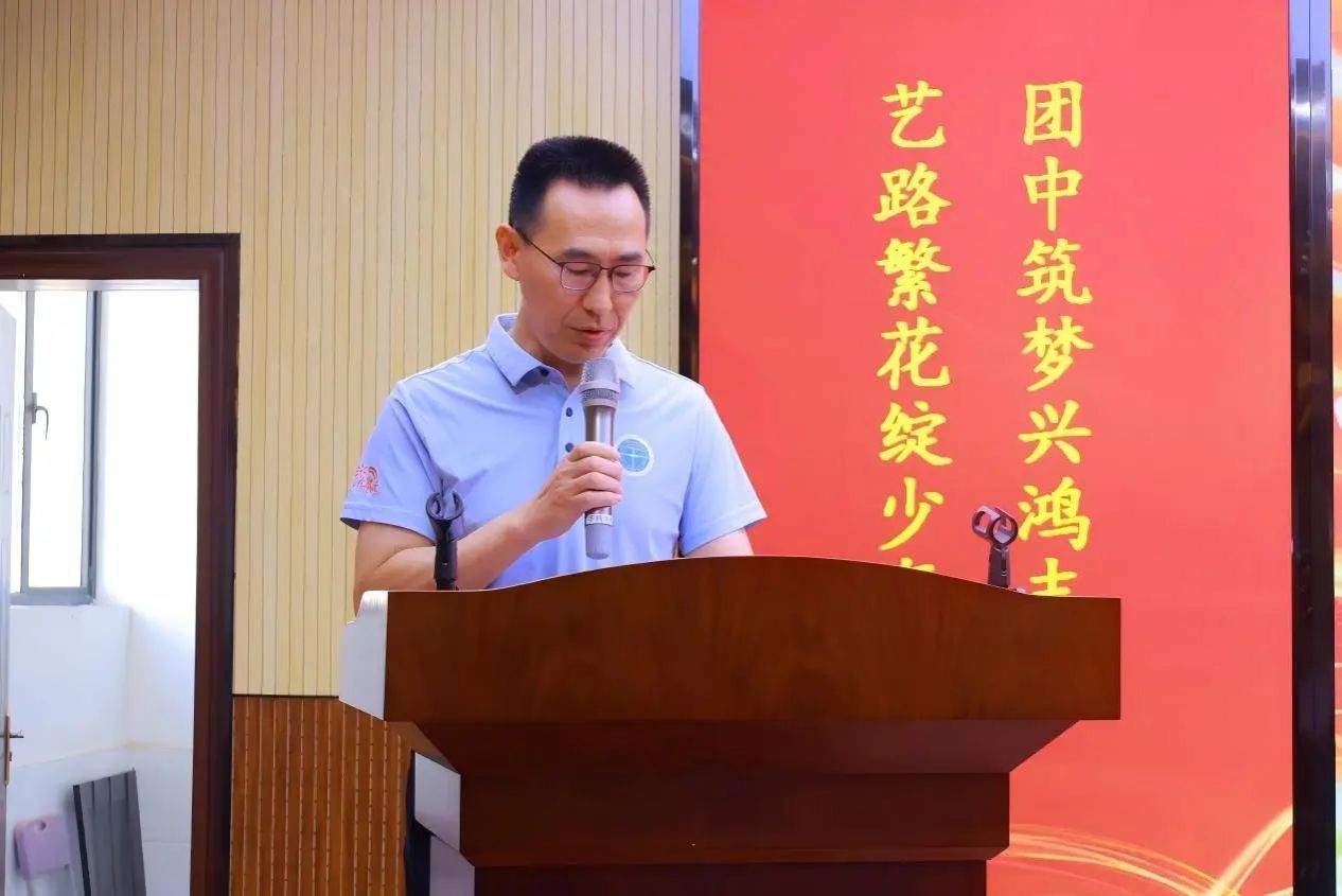 最后,由中国地质大学(武汉)艺术与传媒学院党委书记冷再心致辞。书记介绍了学院及“九里阳光”支教项目的背景。他回顾了团队自2011年成立以来的历程,强调其14年来始终活跃在艺术支教一线,致力于助力中小学美育教育和乡村建设,并曾获评团中央“七彩假期志愿服务示范团队”称号。随后书记对此次支教活动提出展望与要求:希望同学们将安全放在首位,遵从纪律,拿出学习与教育的热情,虚心请教,大力发展美育教育与乡村支持事业。在致辞完毕后,书记宣布中国地质大学(武汉)艺术与传媒学院九里阳光艺术支教行动掇刀站启动。