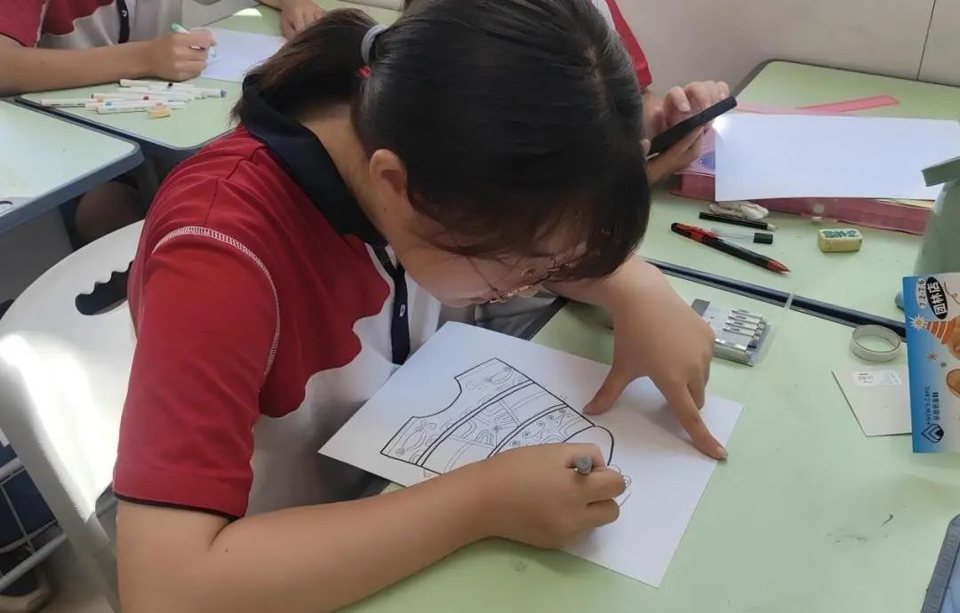 美术课堂中,中学1班的同学们亲手在绘制的团扇落下点睛之笔,方寸之间凝结匠心,合影记录下这份成就的喜悦;中学2班则用铅笔勾勒曾侯乙编钟的雄浑轮廓,让青铜厚重感在纸端重生。相较于小学的创意手工,中学课程更注重技法实践与文化内涵的挖掘,同学们在绘制团扇、复刻编钟轮廓时,展现出对传统艺术的细致解读。