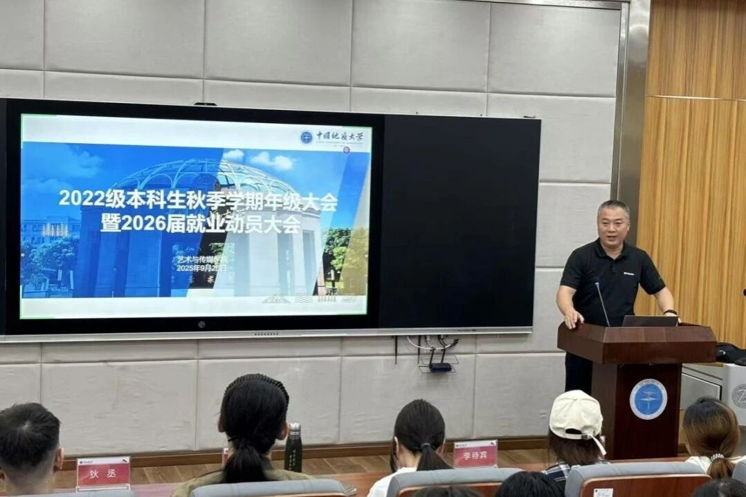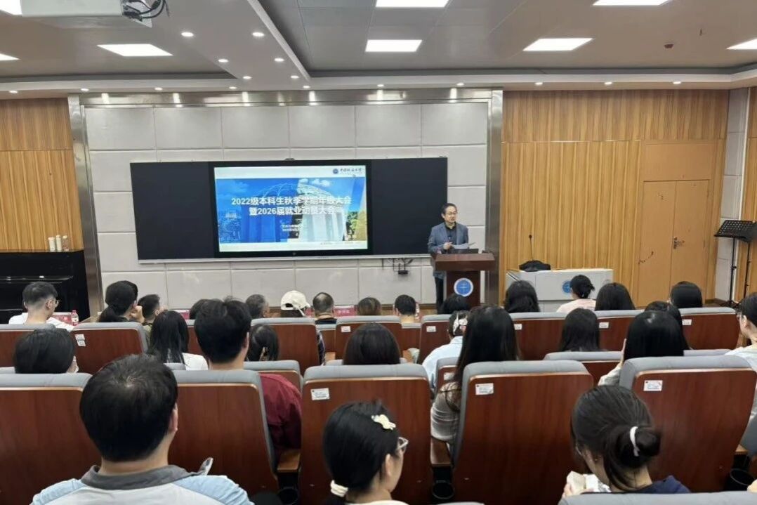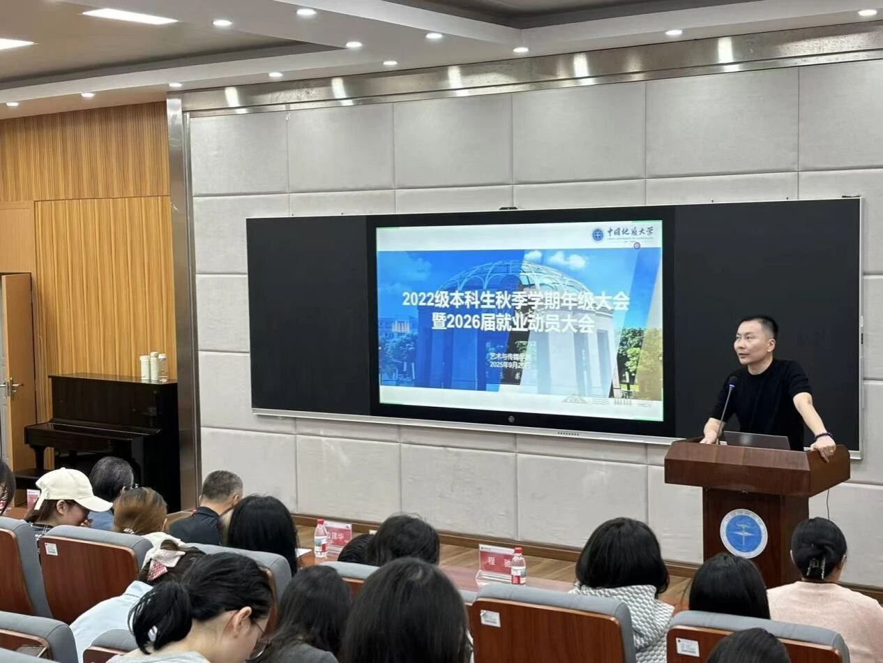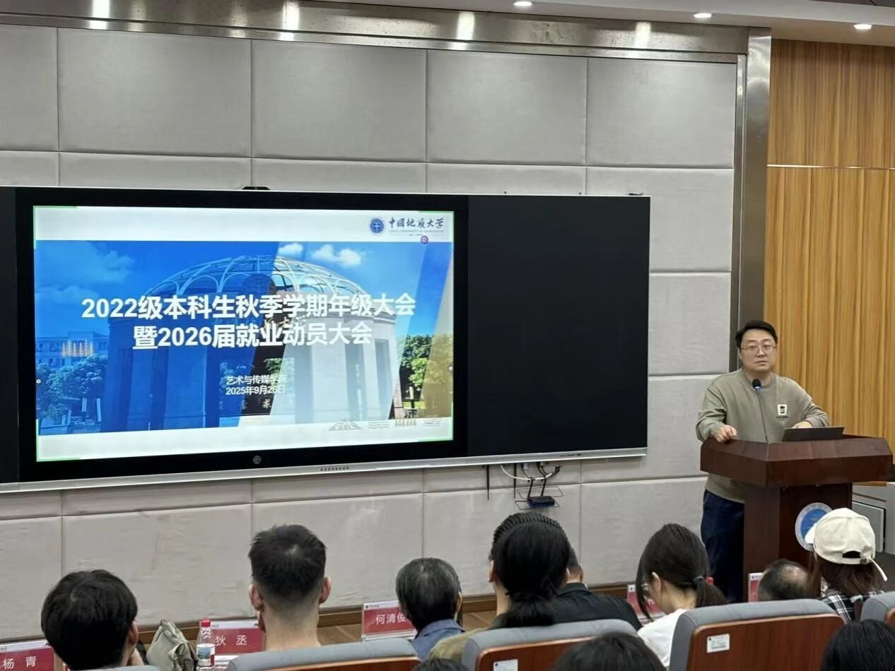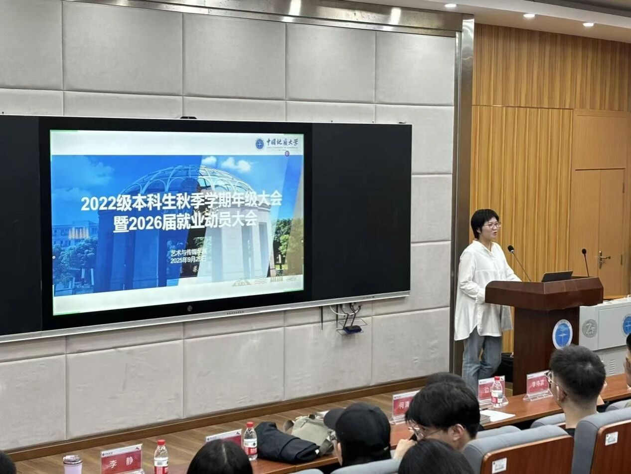 9月26日上午,艺术与传媒学院2022级年级大会暨就业动员大会在艺媒楼1114报告厅举行。院长何清俊,党委副书记边建华,视觉与媒体设计系系主任狄丞,环境设计系系主任李待宾,环境设计系系副主任程驰,音乐系系副主任杨青,新闻传播系专业教师、2026届毕业班班主任李静,学工组专职辅导员曾戈晖,兼职辅导员黄灿以及2022级全体学生参加本次大会。此次年级大会由辅导员曾戈晖主持,聚焦2022级本科生关切的最新考研政策、毕业发展规划指导两大核心议题,为同学们搭建起清晰的成长指引平台。