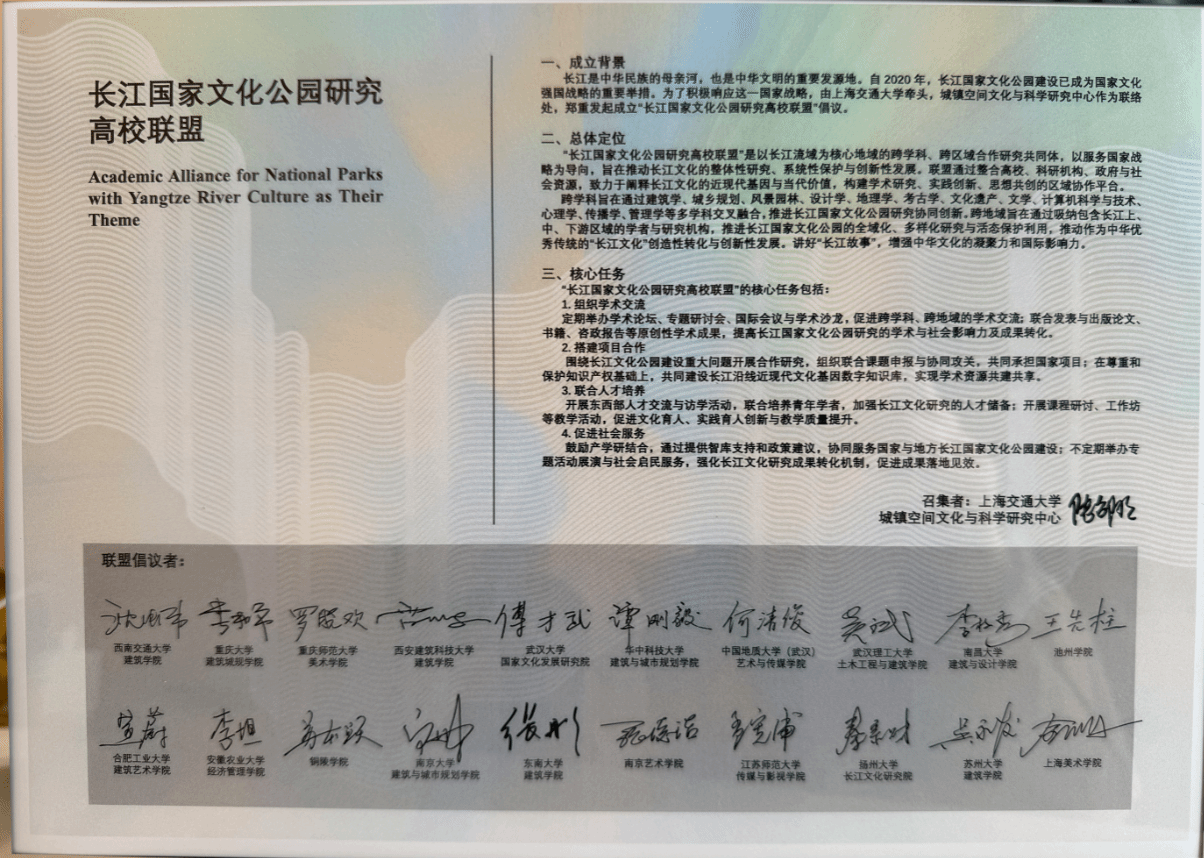 在论坛同期举行的“长江国家文化公园研究高校联盟”签约仪式上,艺媒学院正式成为联盟成员单位。该联盟由上海交通大学城镇空间文化与科学研究中心发起,汇聚长江经济带沿线多所高校、科研机构、政府与社会优质资源,旨在构建以服务国家战略为导向,推动长江文化的整体性研究、系统性保护与创新性发展。