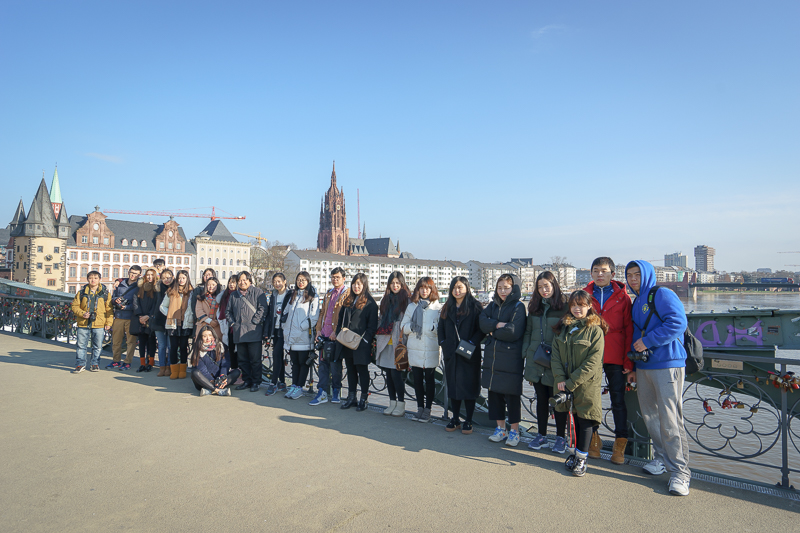 上午11点13分,访学团离开罗马广场,跟随马林老师一同穿过法兰克福的街巷,步行至横跨于美茵河之上的大桥。铁质的桥梁之上挂着同心锁,耳畔吹过的微风卷携着从流浪乐师手风琴中飘出的悠扬乐曲,眼中所见是美茵河河畔风光。站在桥上,还能清晰的看见法兰克福古朴老城区与现代新城区的和谐相融。如斯美景,引得访学团成员赞叹不已。