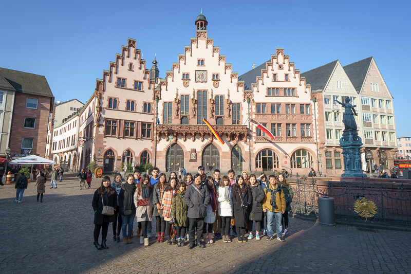 参观完毕,访学团离开法兰克福大教堂,穿过老城区,步行至罗马广场。广场对面的大公府紧挨着最高法院,而正对大公府的地方则立着神女的塑像。神女手持天平,象征着法律的公正与公平。站在广场之上,马林老师向访学团介绍道:“罗马广场修建于欧洲中世纪时期,是德国最重要的城市广场之一,其是按照贝壳的结构建造而成的,十分特别。此外,由于法兰克福的第一任大公是由罗马教廷封禅的,因而罗马广场的‘罗马’指的并不是罗马帝国,而是指神圣的罗马。”