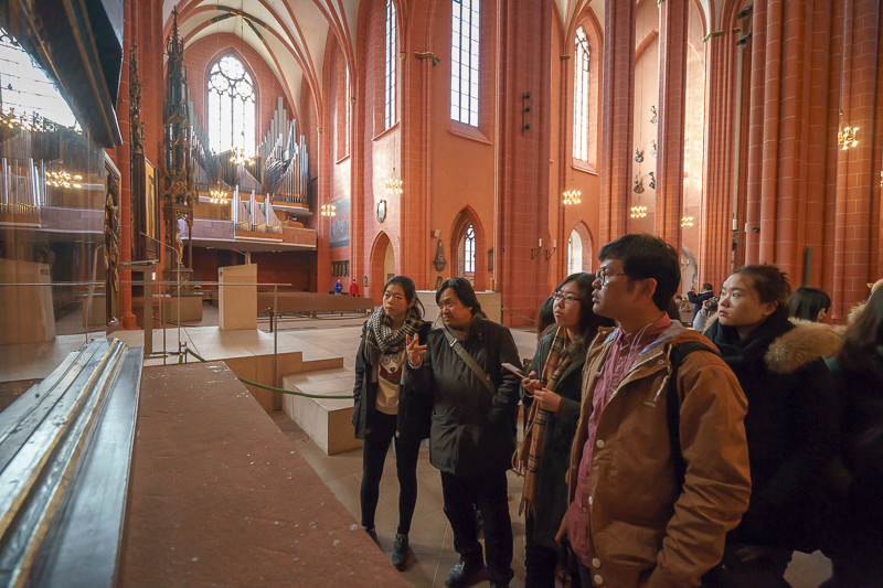 上午10点25分,访学团一行进入老城区,经国家现代美术馆,抵达法兰克福凯撒大教堂。法兰克福凯撒大教堂是一座典型的哥特式建筑,至今已有600多年的历史。教堂虽经过多次战争的洗礼,却依然屹立于此。站在教堂前的街道上,马林老师向访学团详细介绍了法兰克福凯撒大教堂的历史,并表示:“在二战时期,法兰克福凯撒大教堂的顶部曾被轰炸,虽然教堂的钟楼幸得留存,但教堂大部分区域都被严重损毁,所以直至如今仍在修复之中。”随后,访学团进入到教堂内部进行参观。