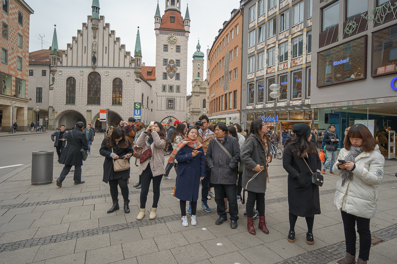 玛利亚广场是慕尼黑的市中心广场。广场中部立着圣母玛利亚的塑像,北面则是慕尼黑市政厅。站在广场的中心,马林老师向访学团讲述了广场上玛利亚塑像的由来,更手指着市政厅中间的钟楼,示意访学团细细观赏,并表示:“在市政厅中间的钟楼上有着著名的玩偶报时钟,在每日的上午11点与下午5点,报时钟内的玩偶便伴随着音乐而出,展现1568年威廉五世大婚与消灭黑死病的场景。而在广场的西北面,则是著名的洋葱顶圣母教堂,它造型独特,是慕尼黑的象征。”