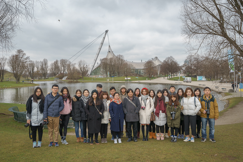 上午11点26分,访学团一行跟随马林老师前往慕尼黑奥林匹克体育场。慕尼黑奥林匹克体育场位于慕尼黑奥林匹克公园的中心,是1972年德国慕尼黑夏季奥运会的主体育场,以颇具革命性的帐篷式屋顶结构闻名于世。走在公园的小径上,远远可见公园中心体育场的独特造型。随后,马林老师带领访学团走近体育场,并向访学团成员介绍道:“奥林匹克体育场的设计师曾从蜘蛛网形状得到的灵感,并受到帐篷结构的启发,从而设计了这个构想奇特、造型别致的体育场。这也使得该体育场拥有了一个半透明的屋顶,既保证了充足的进光量,亦使得场馆中具有丰富的光影变化,使坐在看台的人们犹如置身轻盈的艺术空间,更增添了体育场的神秘感。”说罢,便携访学团成员继续参观。