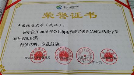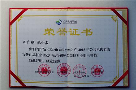 杏色 代表学校参加2015年公共机构节能宣传作品征集活动,获评“优秀组织奖”,研究生陈广榕、魏小嘉的作品《Earth and Eyes》获得视频类高校组三等奖。本届大赛由由国家机关事务管理局、教育部、团中央、国家粮食局联合举办,涉及节水、节电、节粮以及节能环保等主题。