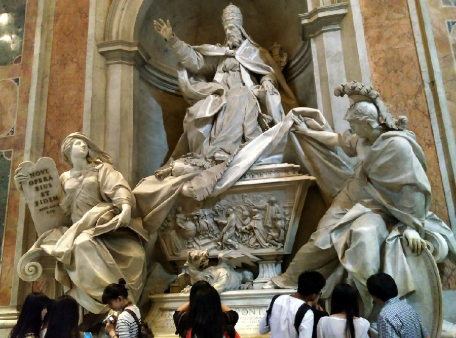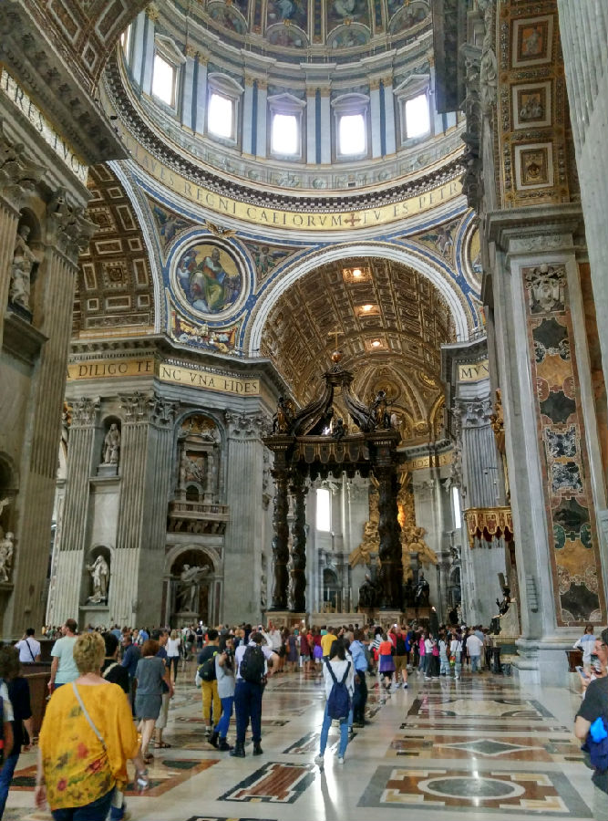 9月5号上午,罗马实习写生小组来到了“城中之国”梵蒂冈,在熙攘的人群里远远地就看到了世界上最大的教堂“圣彼得大教堂”,教堂前面的由建筑大师吉安.洛伦索.贝尔尼尼设计的“圣彼得广场”黑压压排满了长队,由艺术大师米开朗琪罗设计的巨型穹顶屹立在大教堂顶部。广场由弧型的建筑环绕,建筑上每排柱子上都立着雕塑。