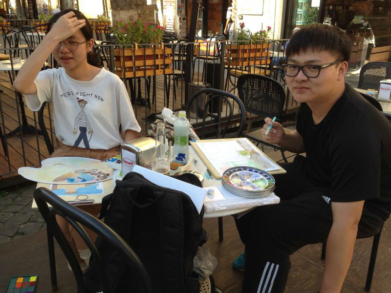 罗马实习小组自8月25日抵达意大利威尼斯之后,每天的活动安排非常丰富,有时候一天赶赴三个不同地点,体力消耗较大。尤其是威尼斯双年展,整天观展,脚不停步,还要吸收大量的新信息。开始几天,睡觉时间通常在半夜一点以后。9月1日没有安排外出,全天在斯波莱托写生,以便第二天的写生展览有更多的作品可供挑选,也为下一阶段罗马的高密度参观活动,放松调整一下。小镇居民看到写生的学生们非常可爱,从家里拿出水和甜点给大家,并邀请孩子们到家中,欣赏收藏的文艺复兴时期的圣母像。