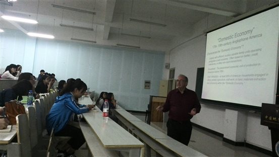 (万力 周志成)10月22日晚7时,美国布莱恩特大学文理学院院长David Lux教授在我院1104教室,以“从家庭经济到消费社会”为题,为我校100多位师生梳理了美国历史。