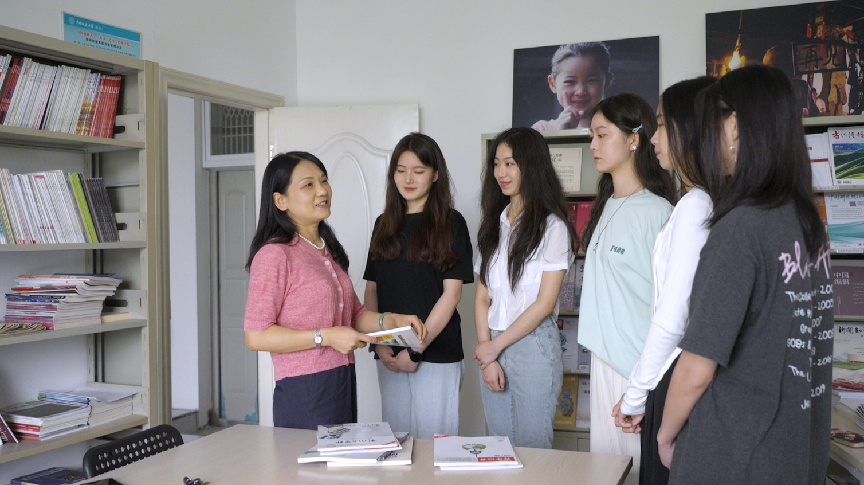 研究生王雪蓉(左一)在《党的女儿》中出镜主持